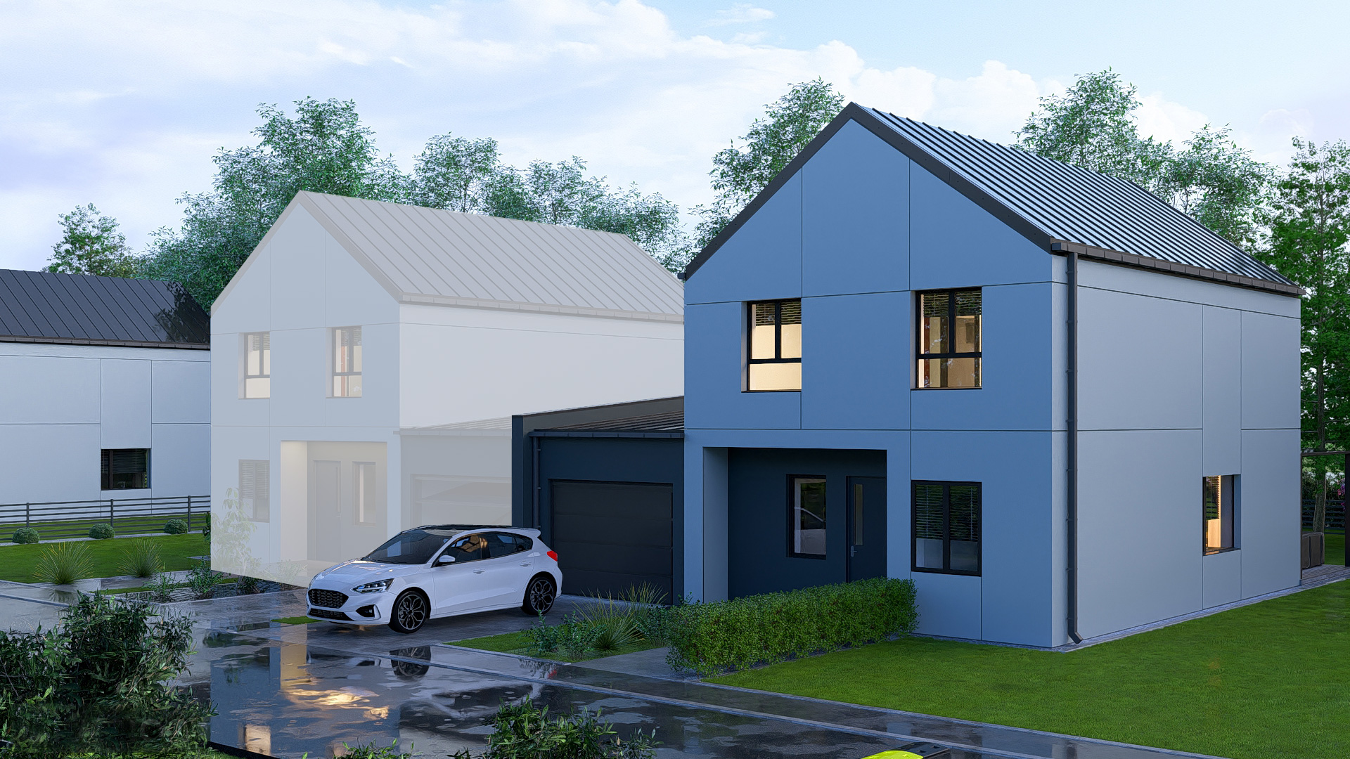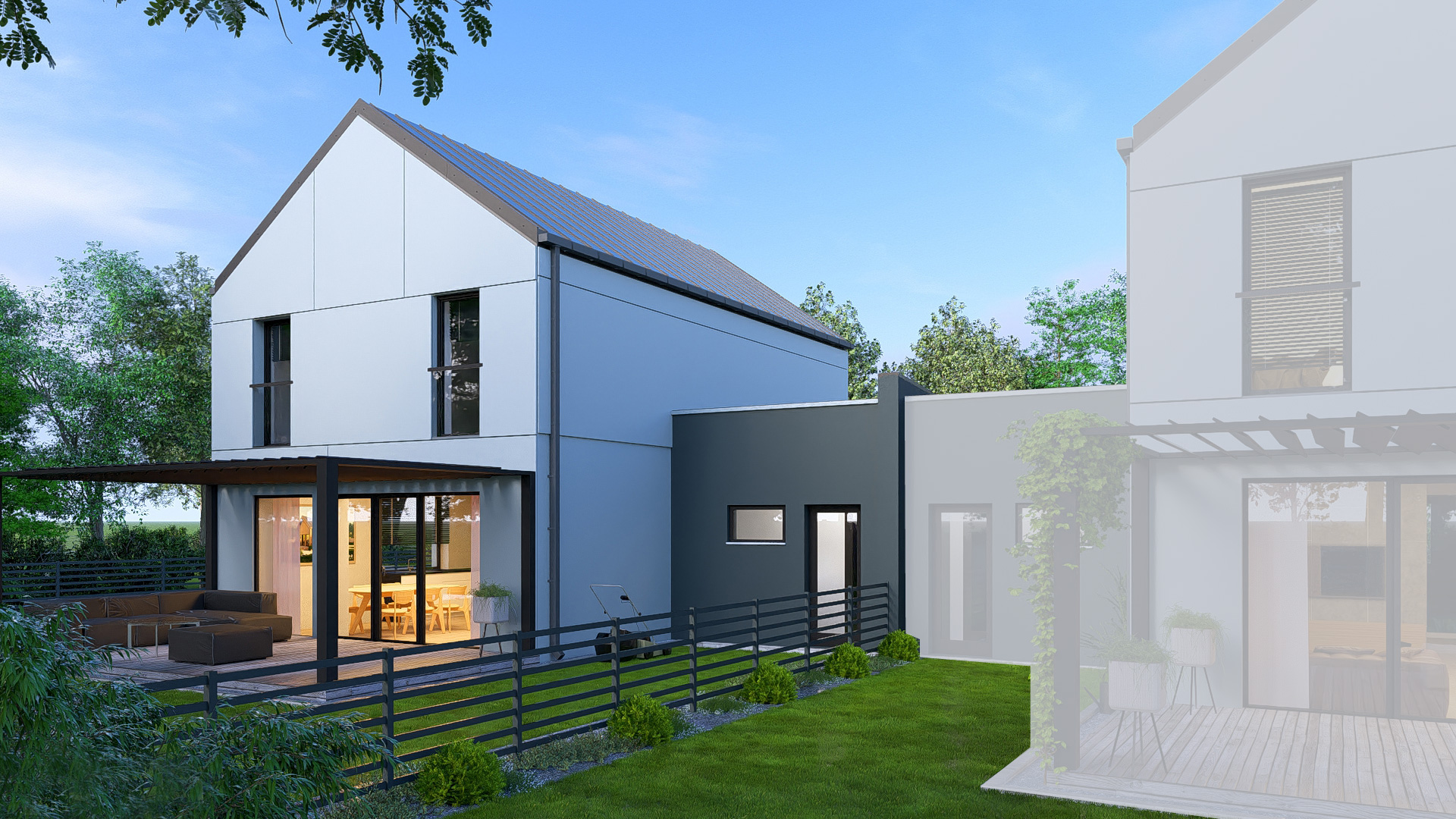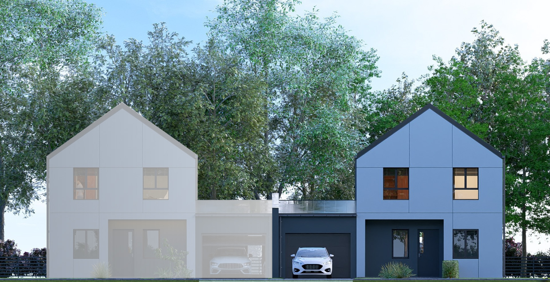 Dom CASTOR SOLO to projekt piętrowego domu prefabrykowanego z garażem. Nowoczesny desing, naturalne materiały budowlane i wykończeniowe pozwolą domownikom żyć zdrowiej i wygodniej.