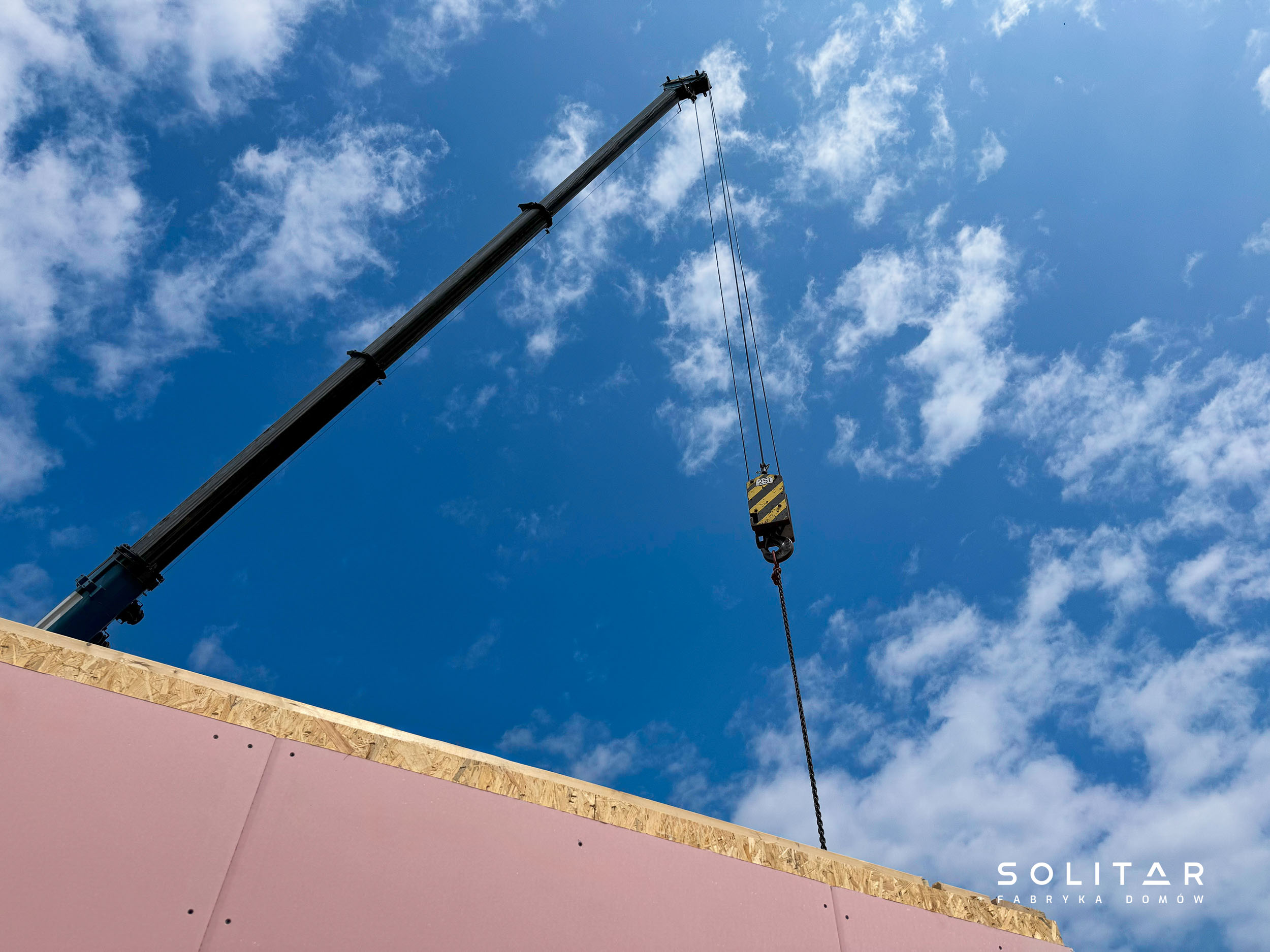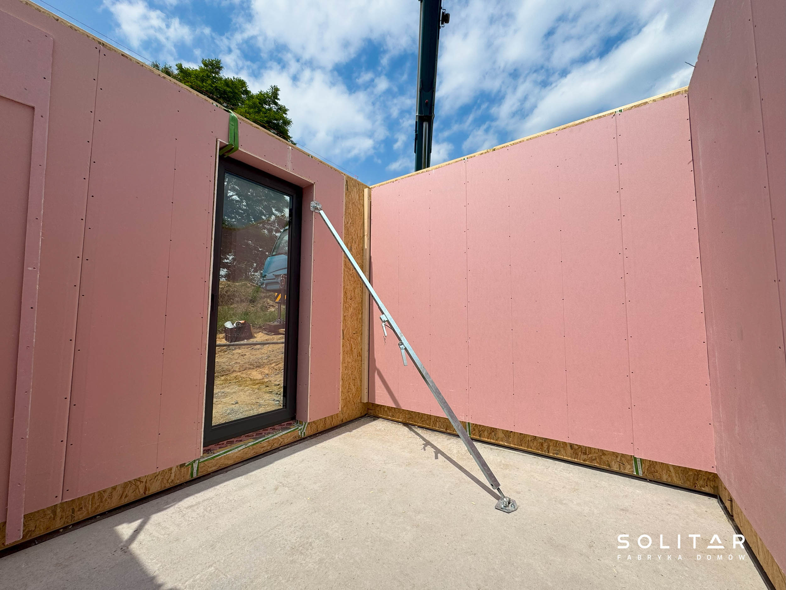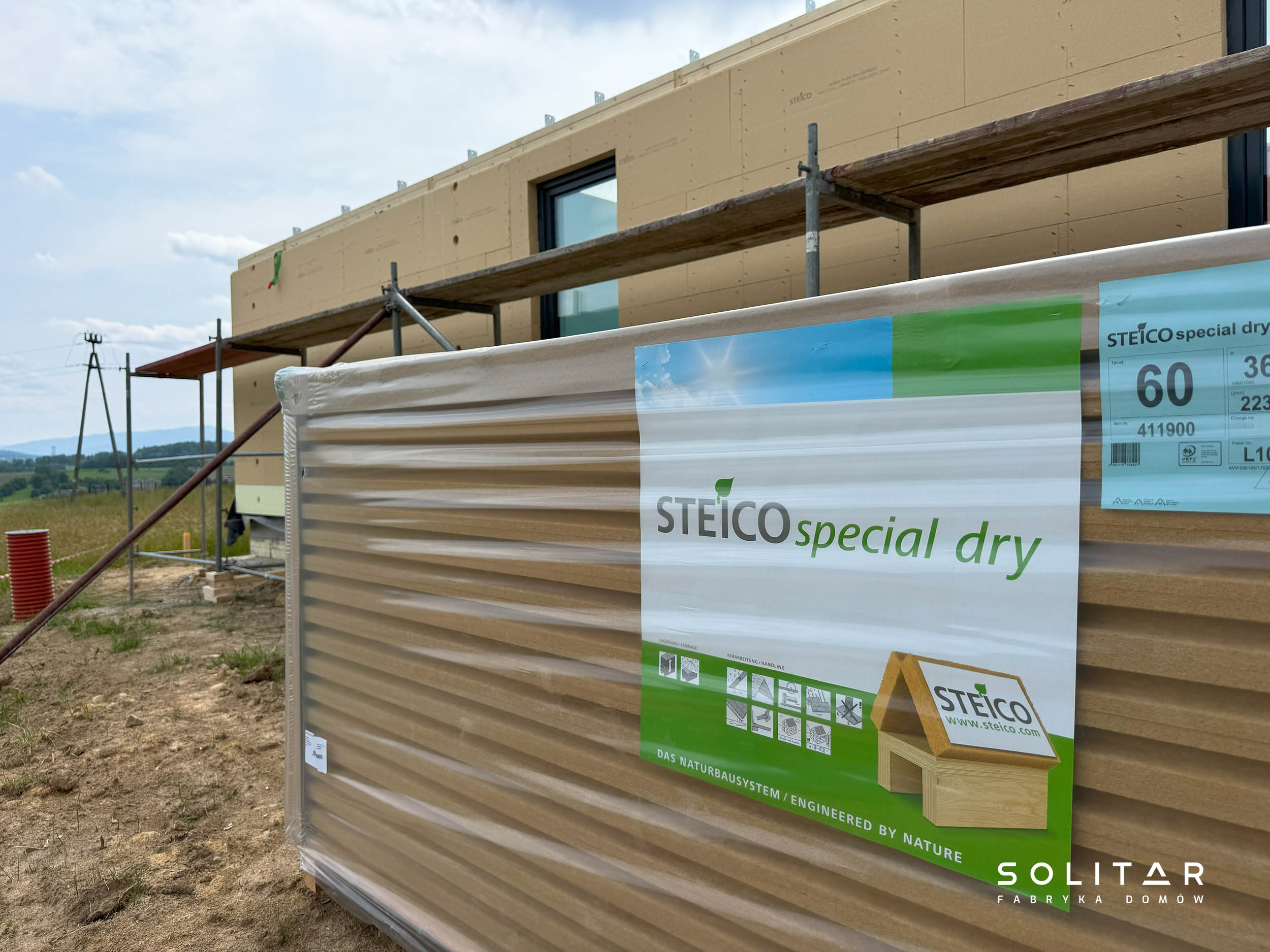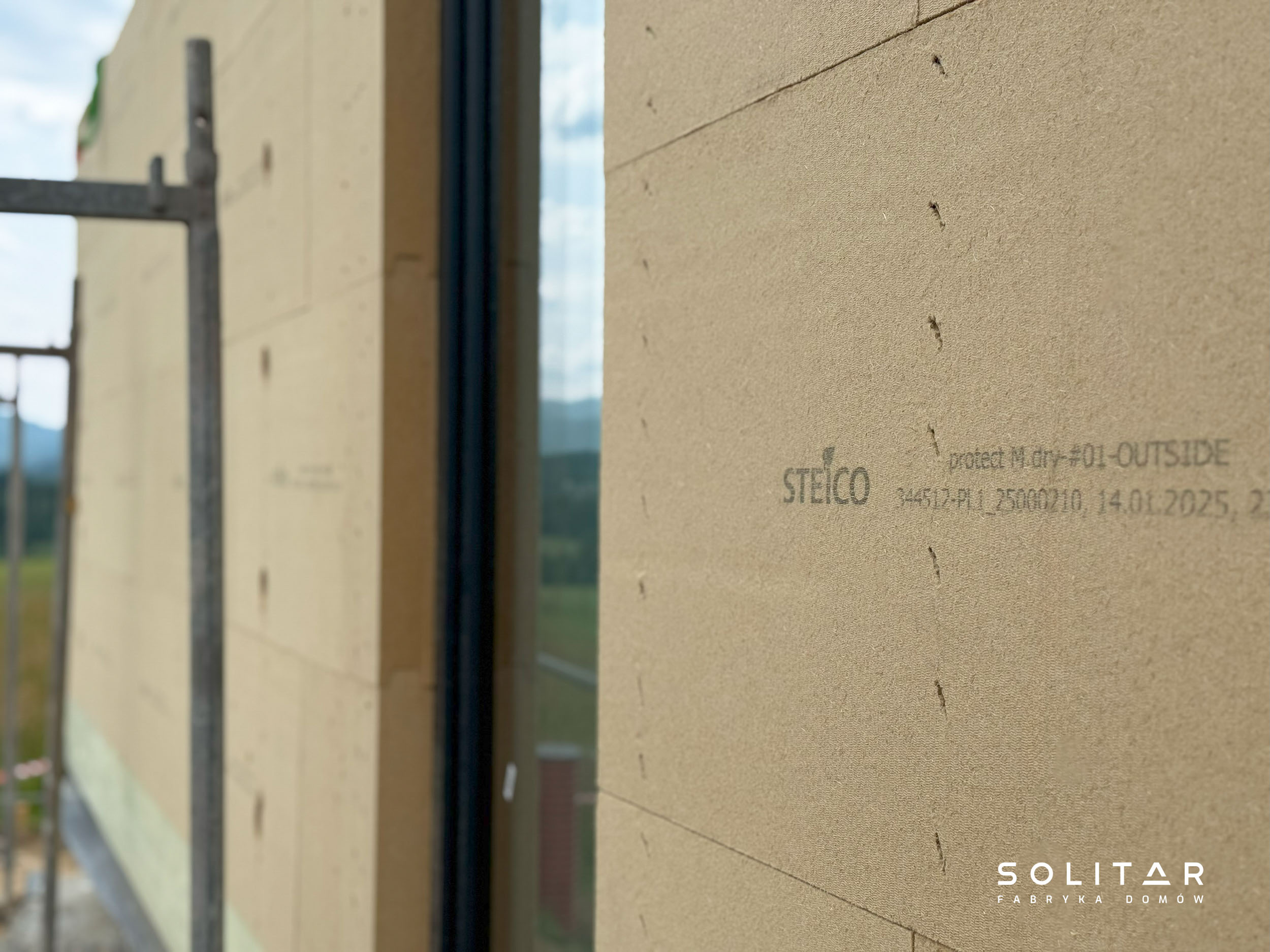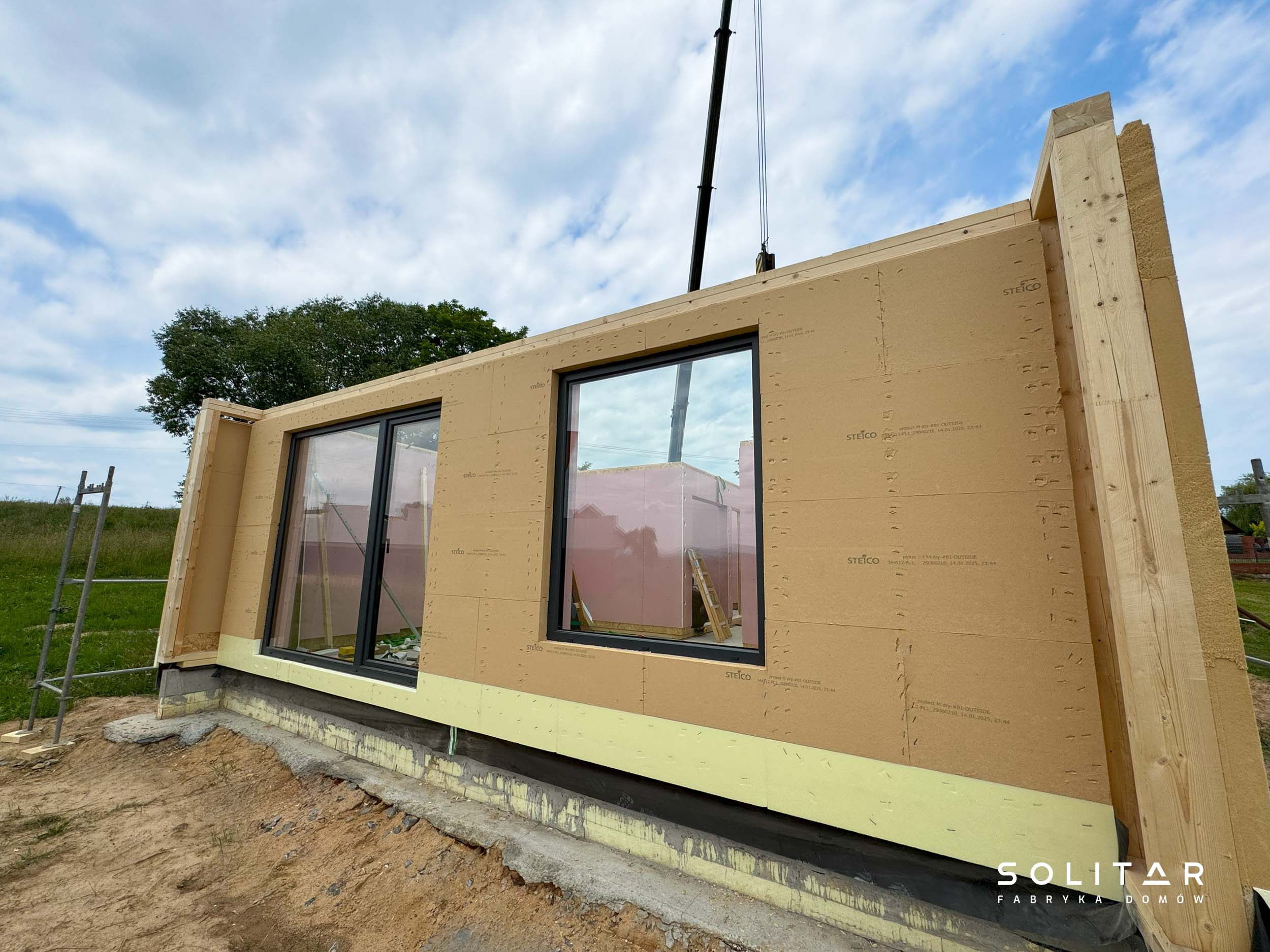 Ważne parametry domu prefabrykowanego dla ściany zewnętrznej: Przenikalność cieplna, U=0,165 W/(m²·K), Przesunięcie fazowe temperatury=14h (w upalne dni z zewnątrz do wewnątrz)
